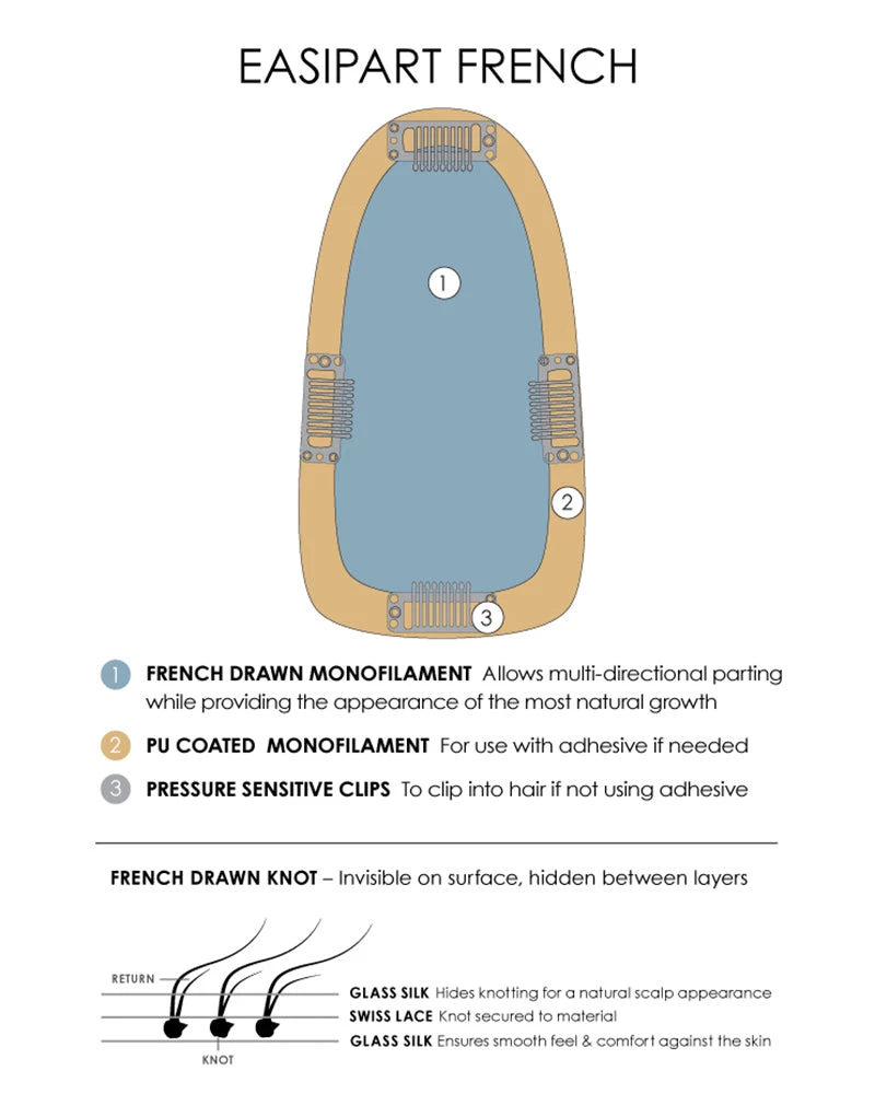 This clip in topper, worn over the part, adds volume to medium-length styles with beautiful Remy human hair. The design is hand tied using French knotting, a superior knotting technique that creates the most natural appearance possible.