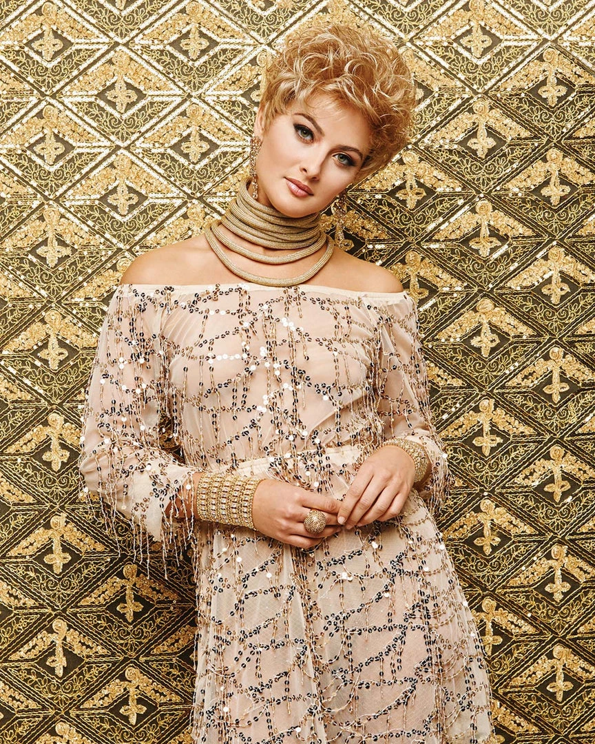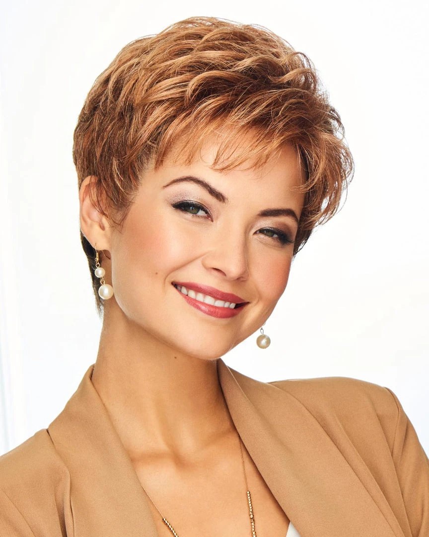 Short, waved layers beautifully blend to a neck-hugging, tapered nape.