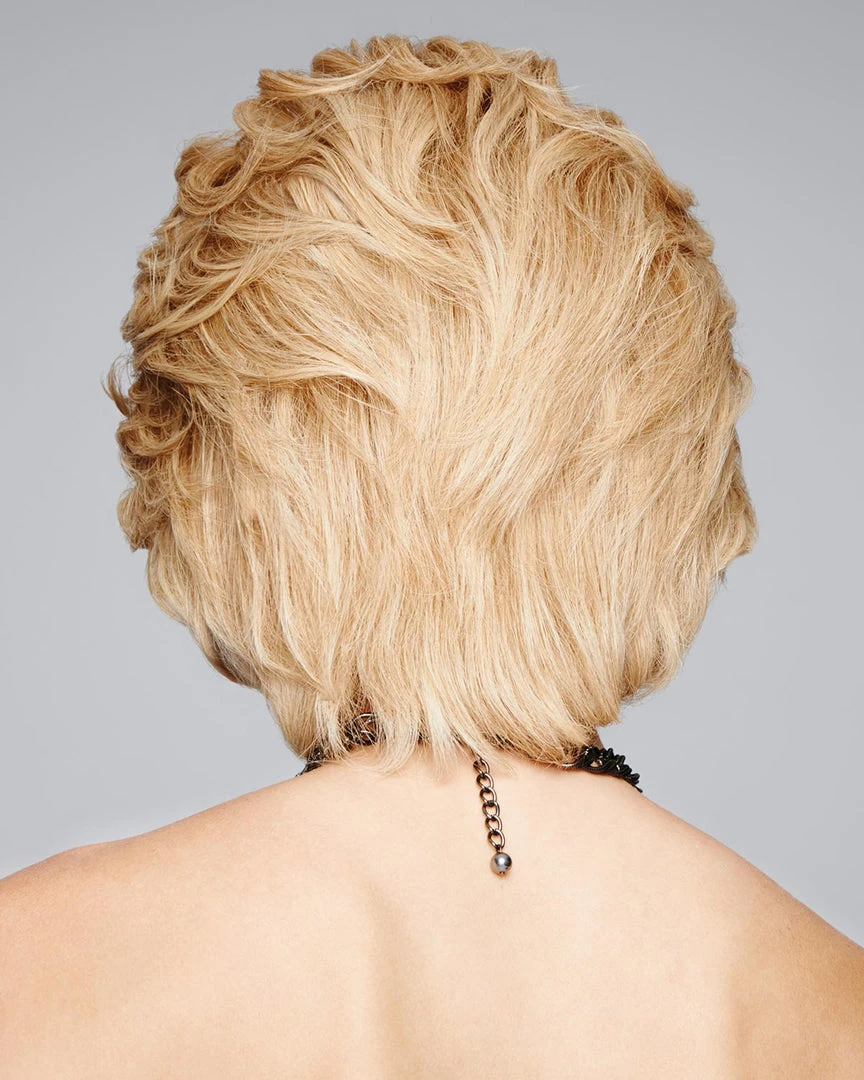 A 100% hand knotted human hair short layered cut combined with a natural looking hairline of a Sheer Indulgence lace front cap for off the face styling with cool, light comfort of the Sheer Indulgence monofilament top, plus the added styling versatility of human hair.