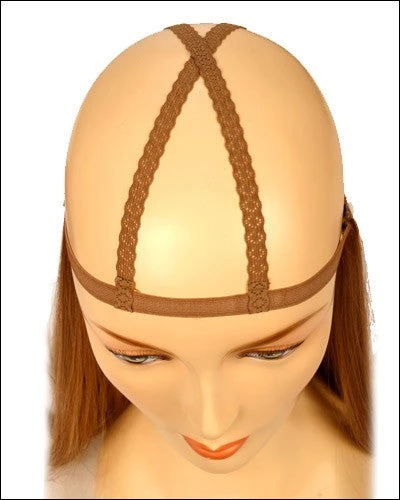 Synthetic hair was worn overhead with cross-over elasticized bands.