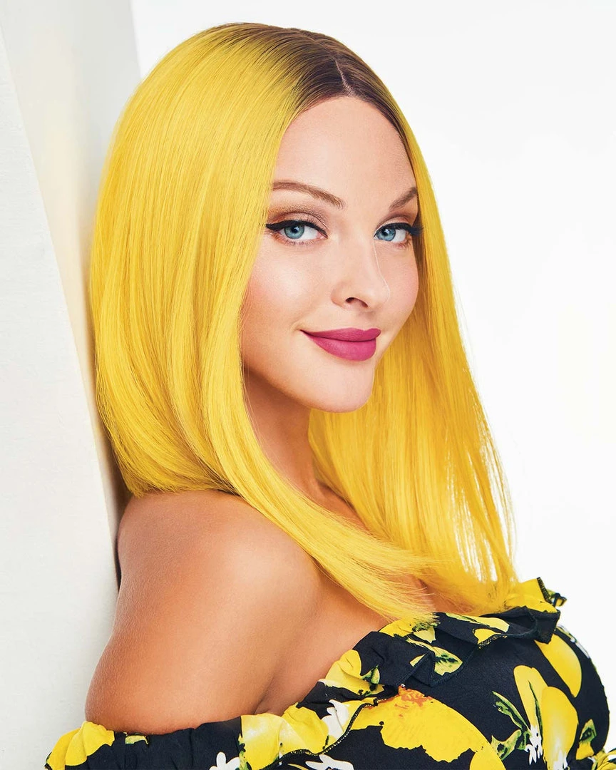 Bright, bold, and beautiful! Commitment-free fantasy yellow hair styled straight with a center part and lace front. The deeper root adds dimension and believability by tying in with your natural hair and brown color. Wear this electric shade with a neutral outfit and let your hair do the talking.