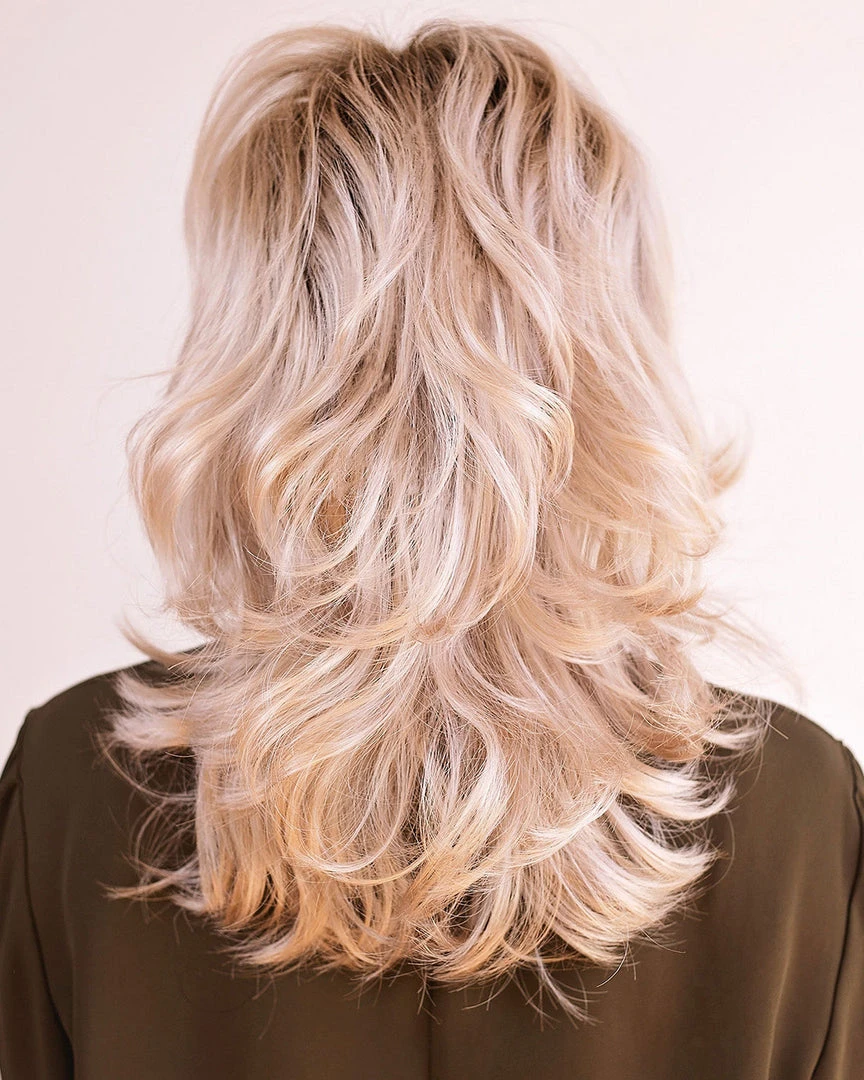 A mid-length with cascading curved layers, Rani is the much-talked-about trendy medium-length shag. Effortlessly chic with the Bob-shaped upper part and a fun feathered finish. She is a little bit Rock-n-Roll and ready for anything. With a side fringe that compliments a lot of natural movement. Rani has a Cool Vibe with texture, movement, and so much dimension.
