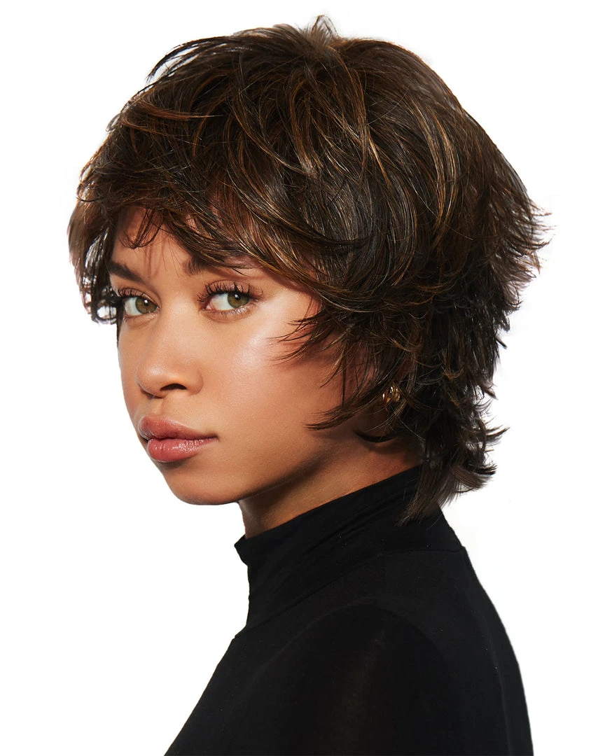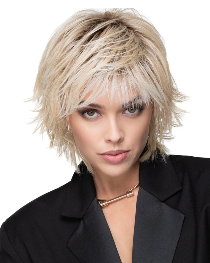 A mid length shag with razor cut layers that brushes smooth or piecey. Special, pre-teased roots adds lift without any bulk.