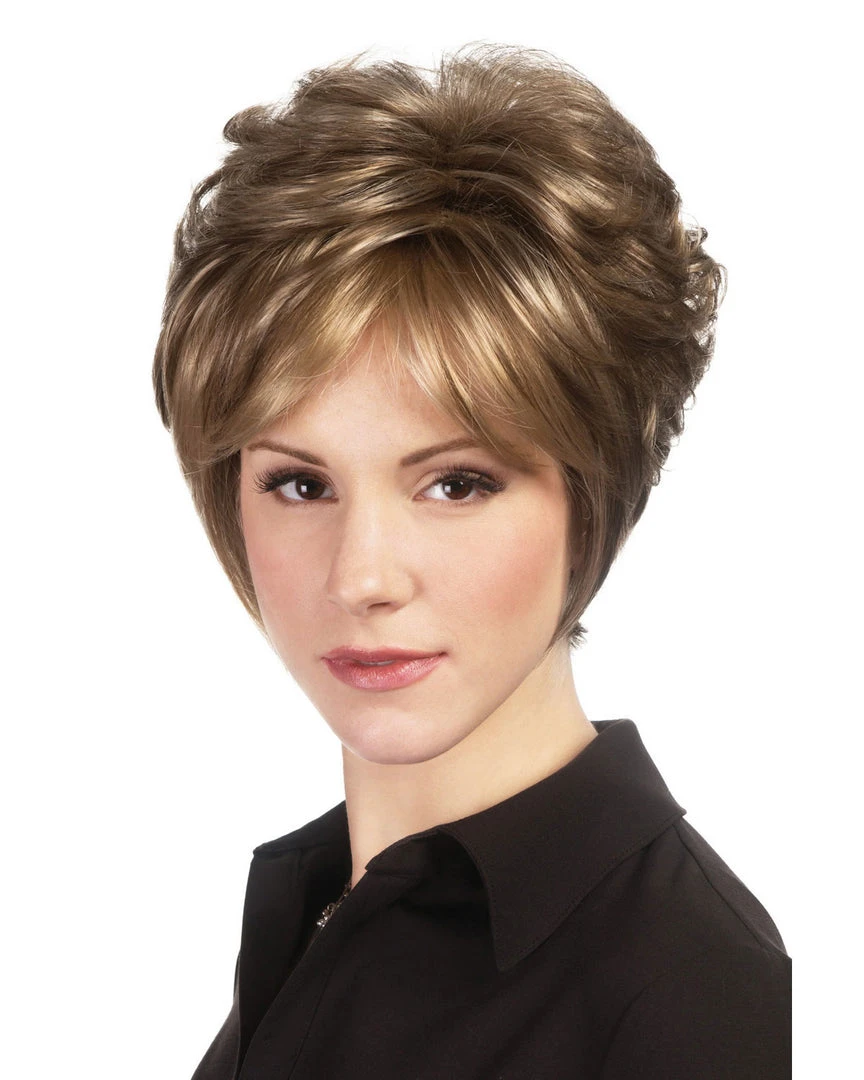 Short pixie with loose curls, wispy long sides & tapered nape.