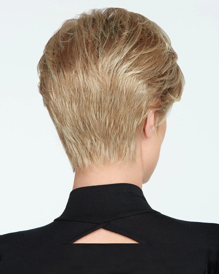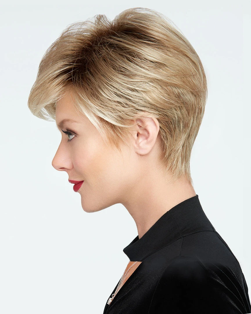 The Go For It Wig by Raquel Welch takes the classic “boy” cut and gives it a complete overhaul with the addition of longer layered areas at the front and sides for more styling options. Thanks to the Sheer Indulgence™ temple-to-temple lace front, the piecey front lengths can be styled off- the- face. The longer, textured sides can be worn swept forward for a voluminous look or gently finger-styled behind the ears for a more streamlined effect. A gently sculpted and textured nape adds to the sophisticated look of this style.