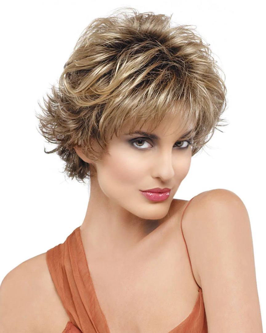 Tapered neckline and swirling waves of soft curls offer a completely wearable style.